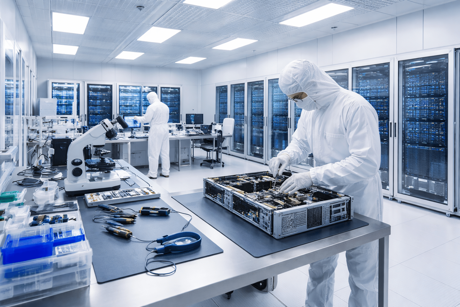En una Sala Blanca para mantenimiento de hardware crítico todo está diseñado para proteger los equipos y garantizar intervenciones seguras:
